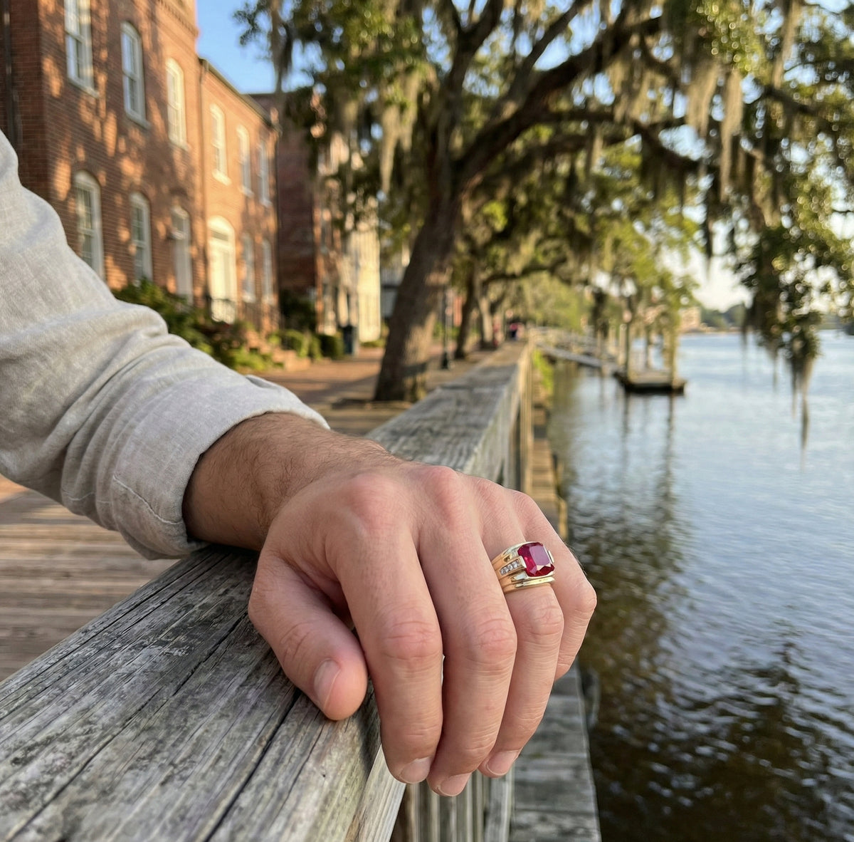 Bold and refined, this 10K yellow gold ring features a vibrant cushion cut ruby center complemented by subtle round diamond accents. The rich red gemstone stands out against the warm gold setting, creating a strong statement design with classic sophistication and everyday durability.