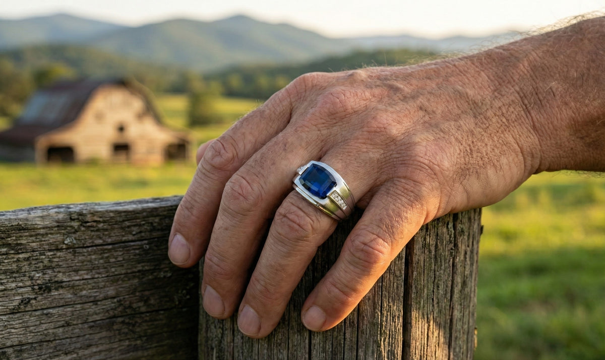 Bold and sophisticated, this 10K white gold ring features a striking cushion cut blue sapphire center accented by sparkling diamonds. The clean, structured design highlights the rich blue gemstone while subtle diamond accents add refined brilliance, creating a timeless statement piece with modern appeal.