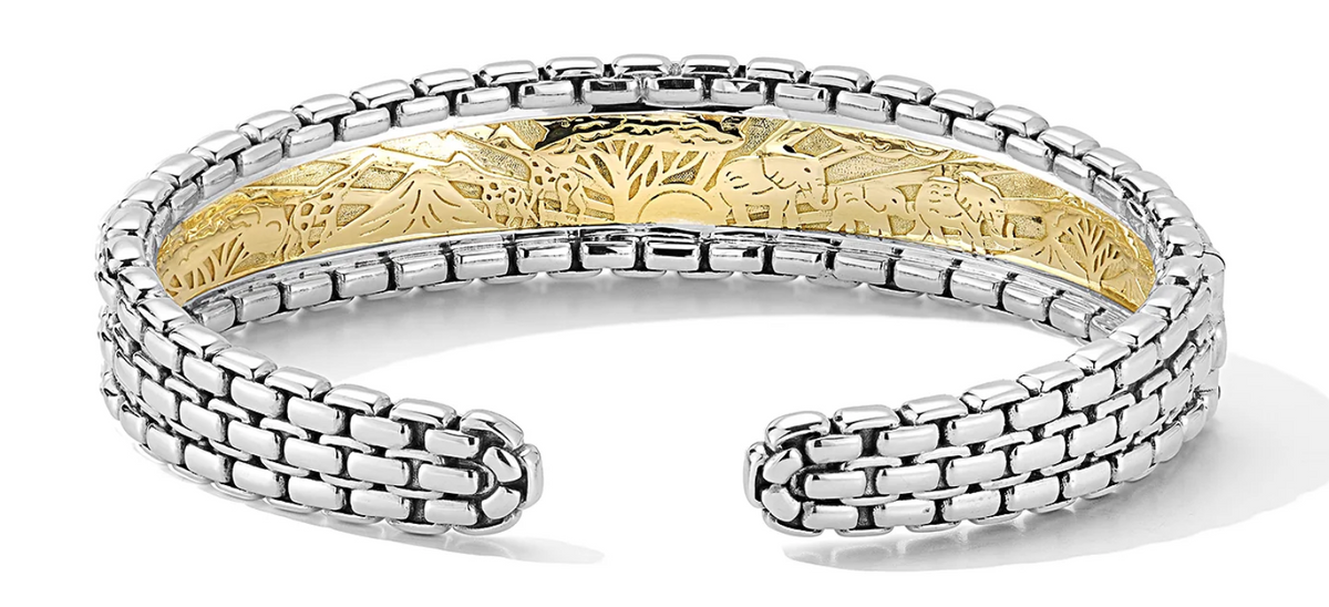 Sterling Silver & 14K Gold Hinged Cuff Bangle features our 14K Gold Hammered center design element gently inlaid within rows of Box Chain. The interior 14K Gold surface showcases our signature carved art work. Cuff opening is 15mm. Sizes with Inside Dimensions: Large (52x63mm) Medium (51x61mm) Small (50x59mm)