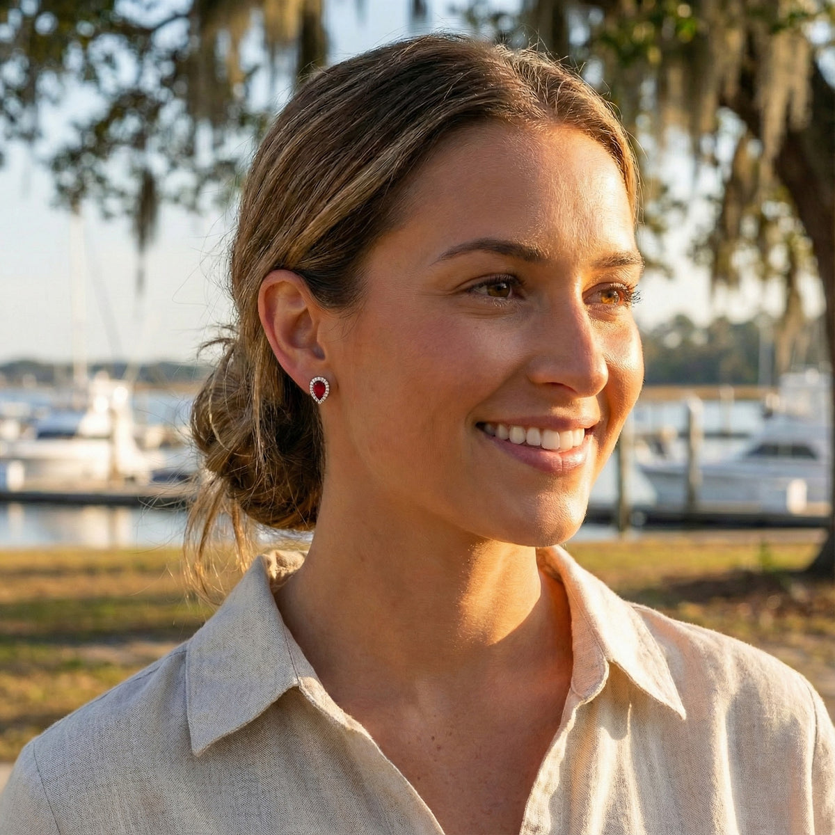 The Brownlee 14K Yellow Gold Ruby & Diamond Halo Stud Earrings make a bold yet timeless statement with rich color and classic brilliance. Each earring showcases a vivid pear-shaped ruby at the center, symbolizing passion and elegance, surrounded by a sparkling halo of round diamonds that enhance the ruby’s depth and fire. Crafted in warm 14K yellow gold, these halo studs offer a refined silhouette that elevates both everyday looks and evening attire with effortless sophistication. Details: Metal: 14K Yellow Gold Center Stone: Pear-Shaped Ruby Accent Stones: Round Diamonds Total Diamond Weight: 0.25 ctw Style: Halo stud earrings Back Type: Friction (push) backs Finish: High-polish | Included with Purchase: Complimentary Brownlee lifetime cleaning & inspection Secure, comfortable fit ideal for daily wear In-store pickup and professional service available