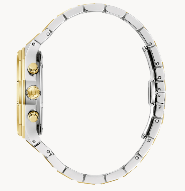 Bold, modern design characterizes this 6-hand chronograph from the Classic Bulova Prestige men’s collection. The watch features a faceted 40mm gold- and silver-tone stainless steel case with a geometric bezel, flat sapphire crystal with anti-reflective coating, 100m of water resistance, and a chamfered 3-link bracelet with a combination of brushed and polished finishes and a push-button deployant closure. The silver-white striped dial has gold-tone hands and applied markers with Super-LumiNova luminescent fill, a date display, and sub-dials including a 24-hour display. Highly functional with a distinctive design, this timepiece is suited for any occasion, from the everyday to the extraordinary.