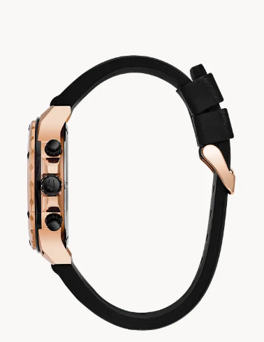 From the Marine Star Collection. High-performance chronograph in stainless steel with black and rose-gold ion-plated finish, black patterned dial, luminous hands, calendar, second hand, mineral crystal, screw-back, and black rubber strap.