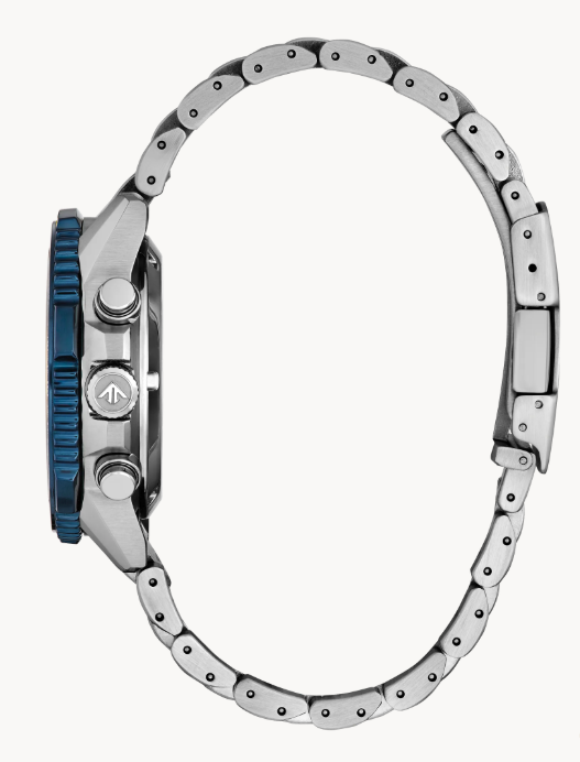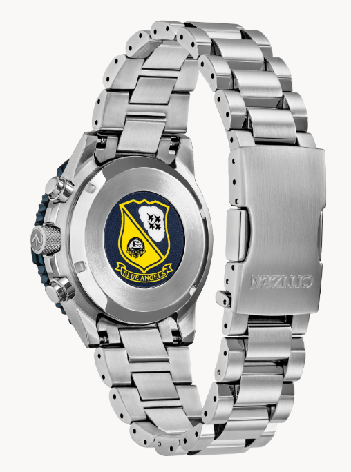 Citizen Promaster Navihawk The Blue Angels are the Navy's elite flight demonstration squadron renowned for their precision and grace showcased in each of their flight maneuvers. Using advanced technology and striking looks, these qualities are once again exhibited through the special-edition Citizen Blue Angels Promaster Air Navihawk. On the wrist, the watch’s silver-tone stainless steel case measures 40mm in diameter, wearing boldly with its sharp faceting and satin finishing, while a slide-rule scale on the blue ion-plated bidirectional bezel provides additional flight utility. A triple-link stainless steel bracelet secures the timepiece. On the dial, a Blue Angels colorway with black and white accents adds to the watch's superior legibility, while a sapphire crystal and 200m of water resistance protect it all. Functions include a 1/5 second chronograph measuring up to 60 minutes, 12/24 hour time displays, and a date indicator. The movement is protected via a Blue Angels' insignia-signed case back, and is powered by Citizen's Eco-Drive technology – sustainably powered by light and never needing a battery. Caliber B620.