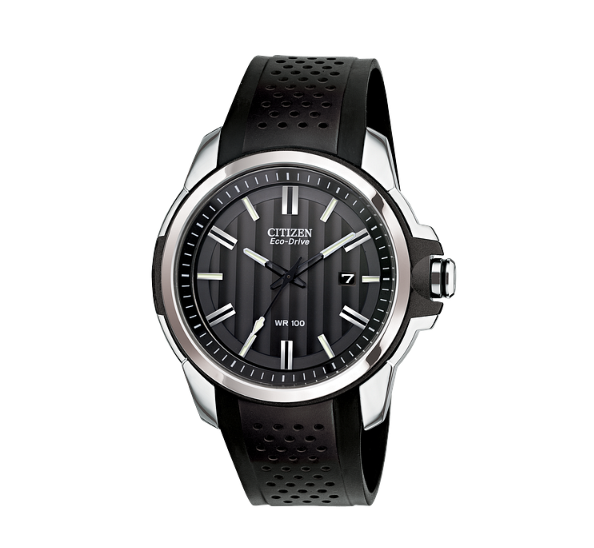 Take action and show your inner drive with the rich and sporty styling of AR 2.0. Black resin accents enhance the 44.5mm stainless steel case, while the dial sports a modern black pinstripe design. Features include date, luminous hands and 100M WR. The crown’s distinctive “D” and the pierced polyurethane strap completes this edgy look. From the Citizen Design Studios, Drive from Citizen Eco-Drive is fueled by light, any light, so it never needs a battery. Featuring our Eco-Drive technology – powered by light, any light. Never needs a battery. Caliber number J810.