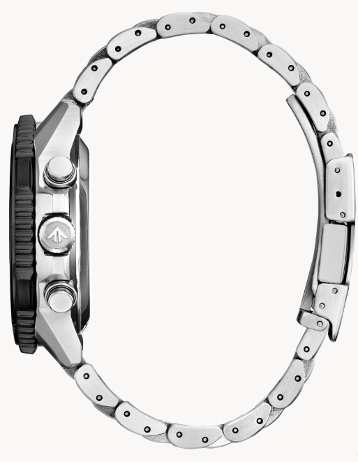 With advanced technology paired with an incredibly bold look, the latest Promaster Air Navihawk reaches a higher altitude in style. The watch's silver-tone stainless steel case measures 40mm in diameter, wearing boldly with its sharp faceting and satin finishing, while a slide-rule scale on the bezel provides additional flight utility. A triple-link stainless steel bracelet secures the timepiece to the wrist.