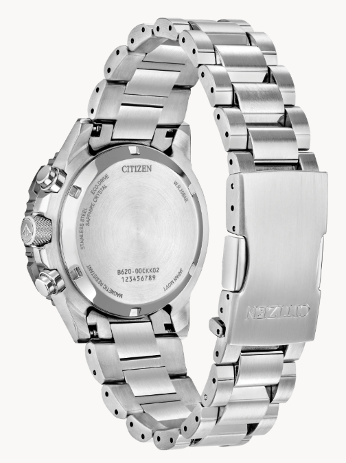 On the dial, a light COPPER colorway with red, black, and white accents adds to the watch's superior legibility, while a sapphire crystal and 200m of water resistance protect it all. Functions include a 1/5 second chronograph measuring up to 60 minutes, 12/24 hour time displays, and a date indicator, all powered by our Eco-Drive technology – sustainably powered by light and never needing a battery. Caliber B620.