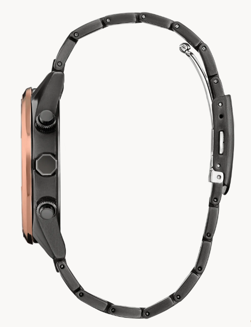Innovative technology once again meets elevated chronograph styling in Citizen's latest: the new Radio Control AT8267. A 43mm stainless steel case in gray and rose gold-tones solidifies the design, with a matching bracelet securing the watch to the wrist. A faceted crown and chronograph pushers add a stylish touch, balancing traditional details with smart, modern accents.
