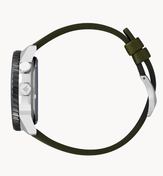 From the olive green leather strap inspired by military uniforms to the 42mm stainless steel case with black dial that evokes a cockpit at night, the Promaster Nighthawk from Citizen is a timepiece designed to capture the sleek, sophisticated lines of a stealth helicopter. Be ready for whatever adventure is next with advanced features such as a slide rule bezel and Eco-Drive technology, powered by light, that will ensure it is always fueled up and ready to fly, along with dual time zones, the current date and a chronograph.
