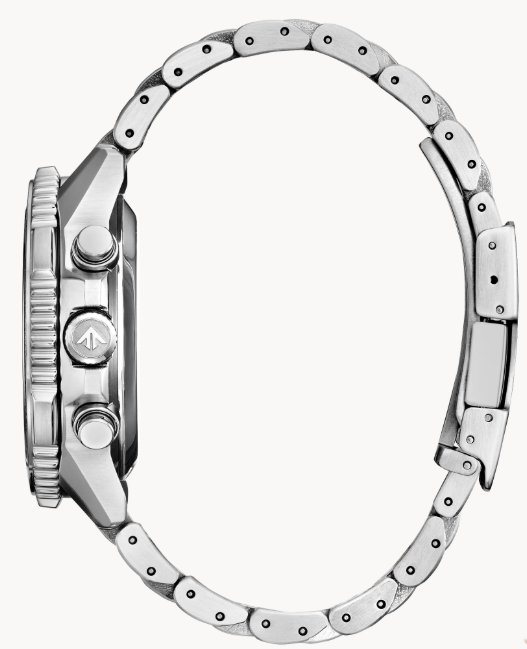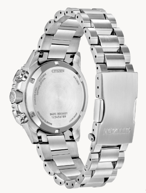 On the dial, a silver-tone colorway with red, black, and white accents adds to the watch's superior legibility, while a sapphire crystal and 200m of water resistance protect it all. Functions include a 1/5 second chronograph measuring up to 60 minutes, 12/24 hour time displays, and a date indicator, all powered by our Eco-Drive technology– sustainably powered by light and never needing a battery. Caliber B620.