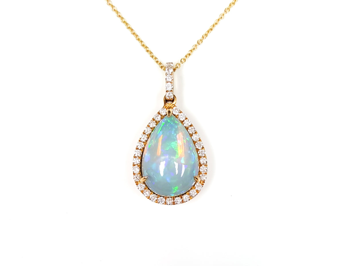 14K Yellow Gold 1.75ct Pear-Shape Opal & .29ct Diamond Pendant A luminous 1.75ct pear-shaped opal radiates vibrant flashes of green, blue, and fiery orange, creating a mesmerizing play-of-color. Framed in a sparkling .29ct diamond halo and set in warm 14K yellow gold with a diamond-accented bail, this pendant blends natural beauty with timeless elegance—perfect for adding an eye-catching glow to any look.