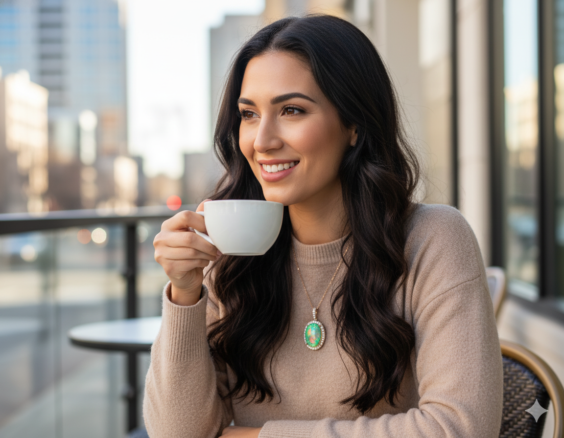 14K Yellow Gold 7.12ct Opal & .43ct Diamond Halo Pendant This breathtaking pendant showcases a luminous 7.12ct oval opal bursting with vibrant flashes of green, orange, and gold. Surrounded by a sparkling .43ct halo of round diamonds and set in warm 14K yellow gold, it blends natural beauty with classic elegance. A statement piece that offers captivating color play and timeless luxury.