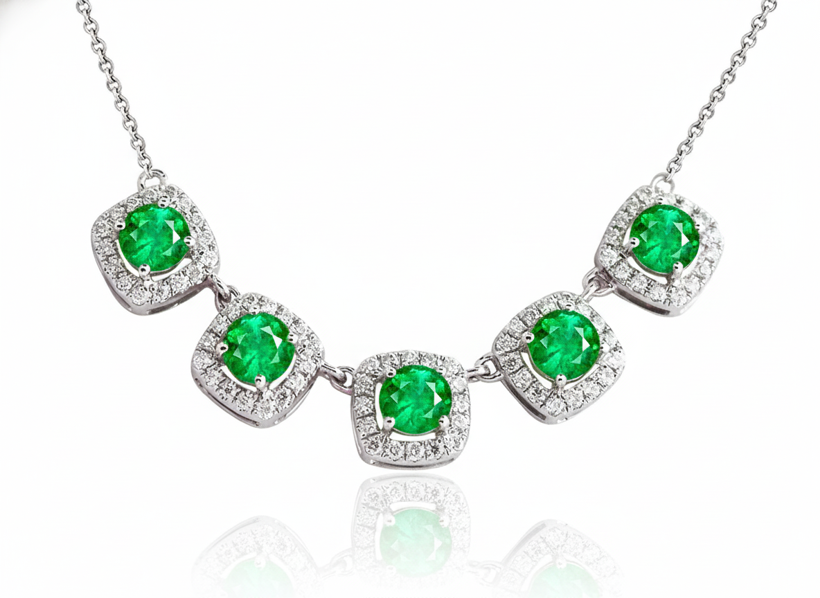 14K White Gold 1.36ct Round Emerald & .38ct Diamond Necklace Bring vivid color and timeless elegance to any look with this stunning 14K white gold necklace. Five vibrant round emeralds (1.36ct total) are each framed in a shimmering halo of round brilliant diamonds (.38ct total), creating a luxurious row of sparkle and rich green hue. Perfect for anniversaries, birthdays, or elevating everyday style, this necklace blends classic sophistication with modern brilliance.