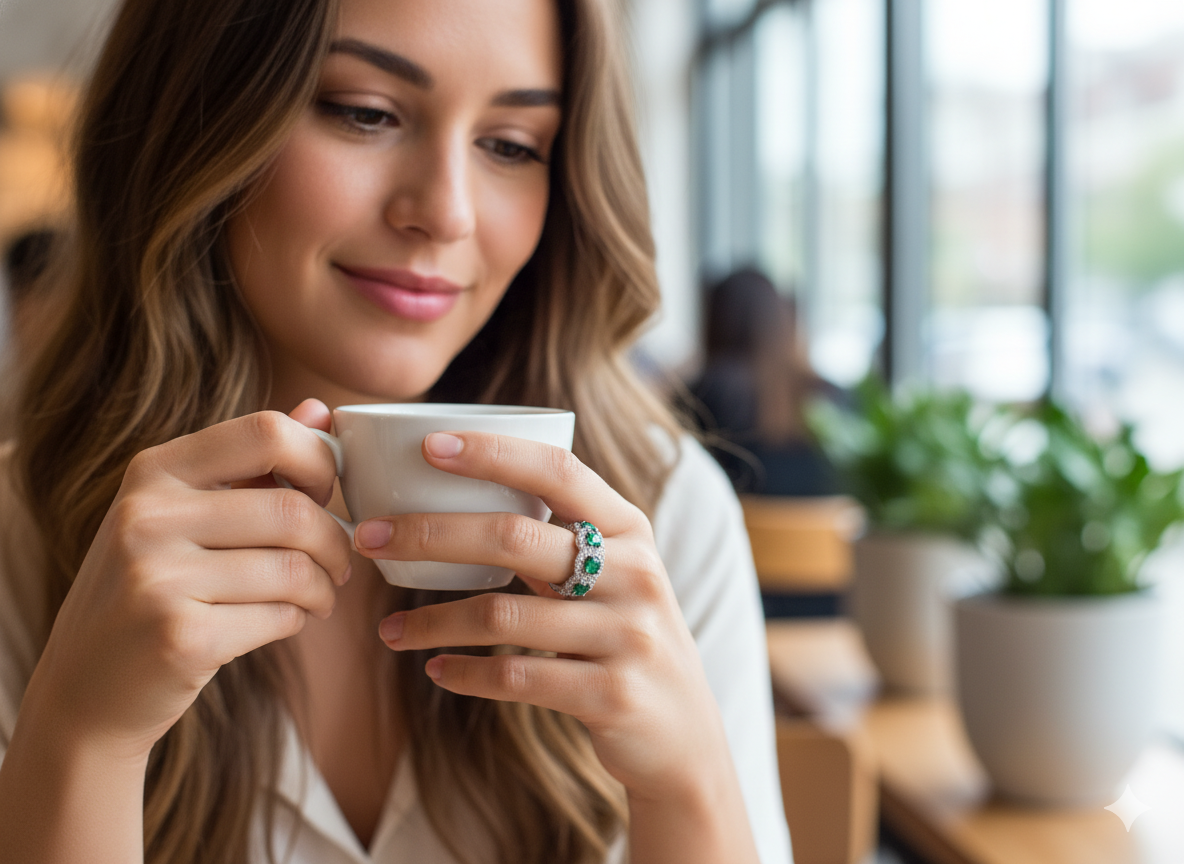 14K White Gold .68ct Emerald & .41ct Diamond Five-Stone Ring Elevate your everyday style with this vibrant 14K white gold five-stone band, featuring .68 carats of brilliant round emeralds set in a shimmering .41 carat diamond halo. Each vivid green emerald is framed by sparkling round diamonds, creating a luxurious, high-contrast look that radiates color and light from every angle. Perfect as a right-hand ring, anniversary band, or a bold stacking piece, this design brings timeless elegance with a fresh, modern edge.