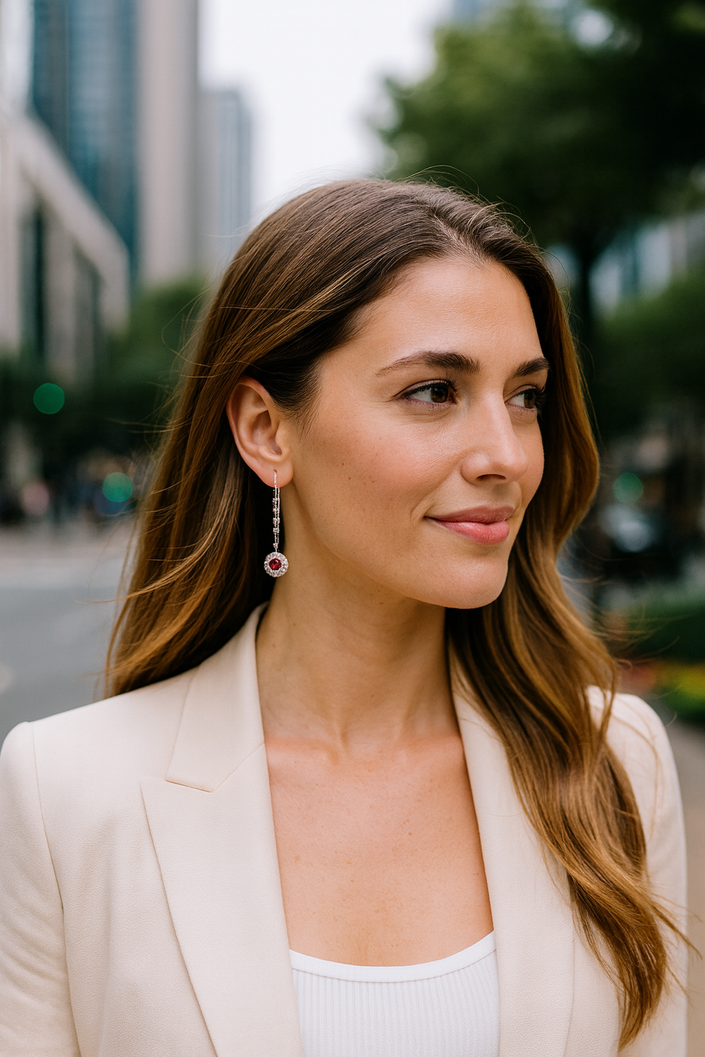 14K White Gold .97ct Ruby & 1.18ct Diamond Dangle Earrings These elegant 14K white gold dangle earrings showcase .97 carats of vibrant round rubies, each framed in a brilliant halo of 1.18 carats of sparkling diamonds. A diamond-lined drop adds extra movement and shimmer, creating a luxurious, eye-catching design perfect for evenings out or any special occasion.