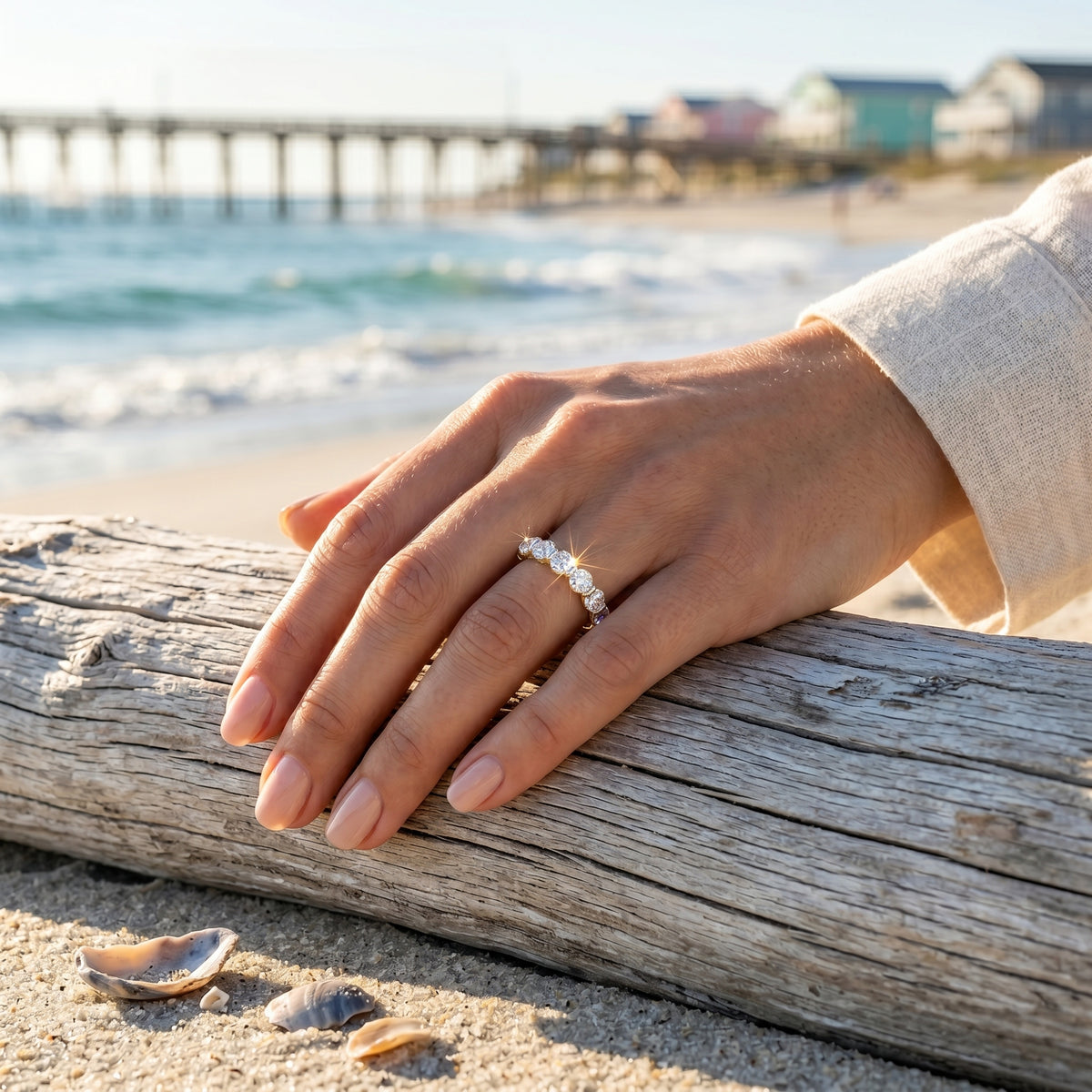 The bezel setting provides a modern, polished aesthetic while offering added protection for each diamond—perfect for an active lifestyle. The oval shapes elongate the look of the finger, giving this band a flattering and elegant profile that pairs beautifully with other rings or by itself.