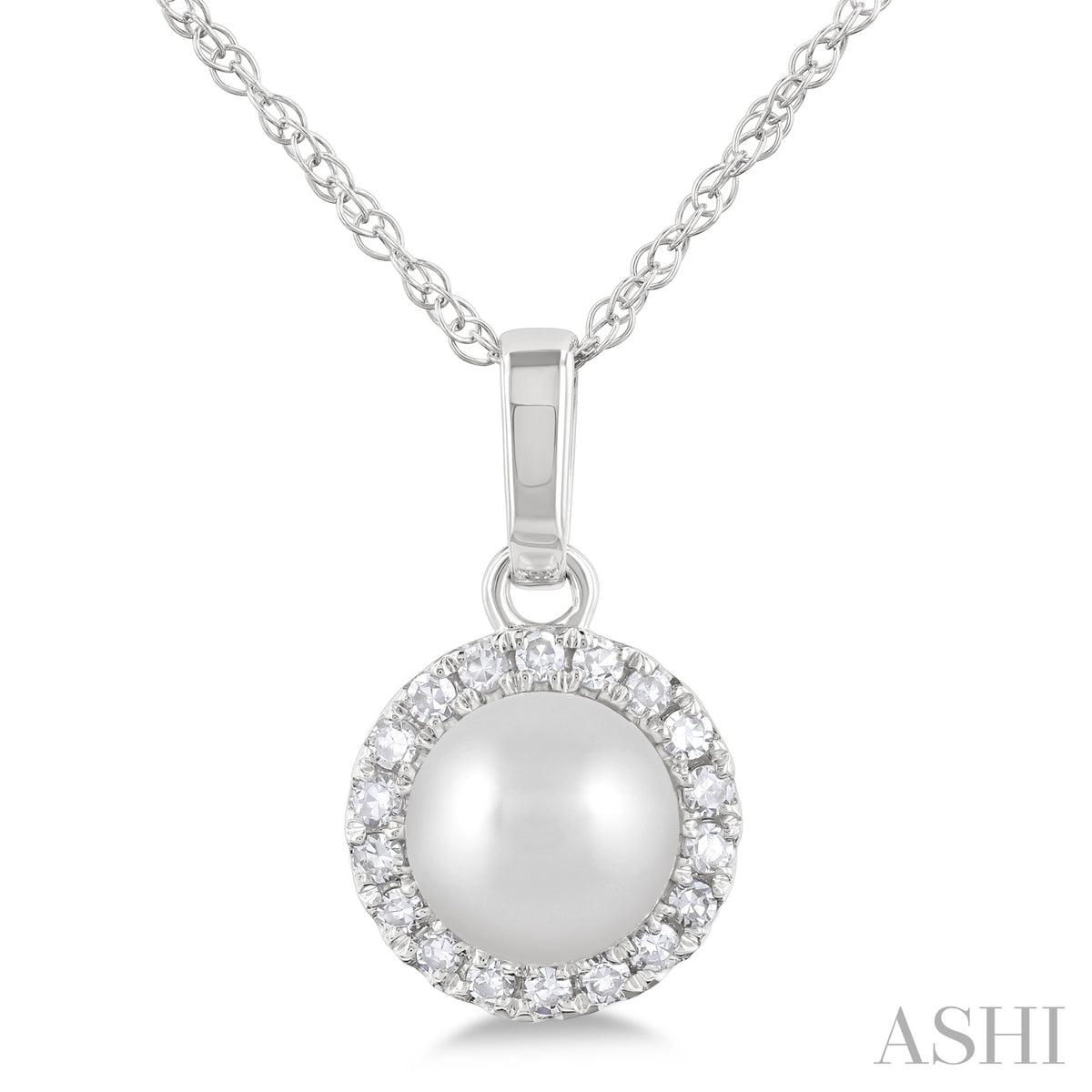Introducing the ASHI 10K White Gold Pearl Diamond Halo Pendant, featuring a luminous 5 mm pearl framed by a delicate diamond halo for timeless elegance and everyday sophistication.