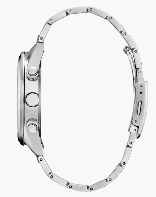 Innovative technology once again meets elevated chronograph styling in Citizen's latest: the new AT8260. A 43mm stainless steel case with contrasting brushed and polished finishing techniques solidifies the design, while a matching bracelet secures the watch to the wrist. A faceted crown and chronograph pushers add a stylish touch, balancing traditional details with smart, modern accents.